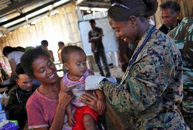 Keywords: Happy and Healthy (8079693097).jpg Lt J G Francesca Harris physician assistant Combat Logistics Battalion 15 15th Marine Expeditionary Unit massages a child ™s arm after administering him a vaccine in a Timor-Leste village Oct 11 during Exercise Crocodilo 2012 This is the first exercise the 15th MEU and Peleliu Amphibious Ready Group has conducted during its Western Pacific deployment During the exercise a total of 10 sites were visited in which corpsmen from the MEU gave health screenings and vaccinations made surgery referrals to a local hospital provided dental care to include tooth removal gave optometry screenings prescribed and provided eyeglasses and issued medication and vitamins for minor illnesses or injuries U S Marine Corps photo by Lance Cpl Timothy Childers For more on the exercise visit http //www dvidshub net/news/96041/15th-meu-lends-helping-hand-timor-leste UHgWpI5LcQQ www dvidshub net/news/96041/15th-meu-lends-helping-hand-t https //www flickr com/photos/marine_corps/8079693097/ Happy and Healthy 2012-10-11 11 03 https //www flickr com/people/40927340 N03 Marines from Arlington VA United States PD-USGov United States Marine Corps Official Page https //flickr com/photos/40927340 N03/8079693097 2016-09-03 23 11 00 United States Government Work Uncategorized 2016 October 29 |
