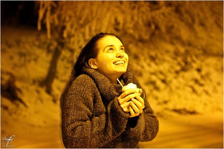 Keywords: happy smiling girl cold night winter coffee cup drink warming woman