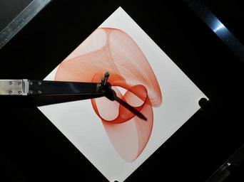 Keywords: harmonograph art artwork red lines aesthetics mechanical device device mechanically overlay harmonious vibration graphic frequency closed curve curve graph lissajous figure phase shift vibration units ellipses