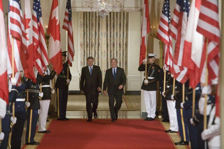 | Keywords: Harper and Bush.jpg President George W Bush and Prime Minister Stephen Harper of Canada hold a joint press conference in the East Room Thursday July 6 2006 I'm impressed by his leadership style said President Bush I appreciate the fact that he doesn't mince words he tells me what's on his mind and he does so in a real clear fashion White House photo by Kimberlee Hewitt PD-USGov George W Bush in 2006 20060706 Stephen Harper in 2006 Stephen Harper with national leaders | ||||