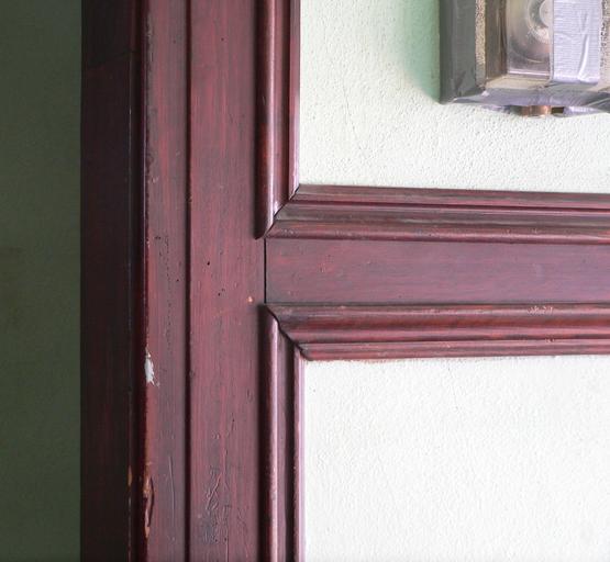 Keywords: Hartington auditorium interior woodwork 1.JPG Hartington Nebraska Woodwork in lobby west side of frame and molding on south-facing door leading from upper entrance lobby into basketball court Note the thermostat at upper right; it can be seen on the longer shot at File Hartington auditorium lower lobby 03 face ESE JPG own Ammodramus 2010-11-25 Pictures by Ammodramus Taken with Panasonic Lumix DMC-FZ20 Hartington Nebraska city auditorium |