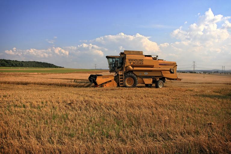 Keywords: harvest harvester blue sky agriculture farming harvesting wheat field grain summer countryside combine agricultural landscape industry machine yellow