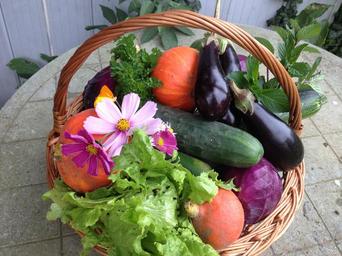 Keywords: harvest vegetables food nature bio market vegetable garden eggplant pumpkin cabbage salad cosmos basket