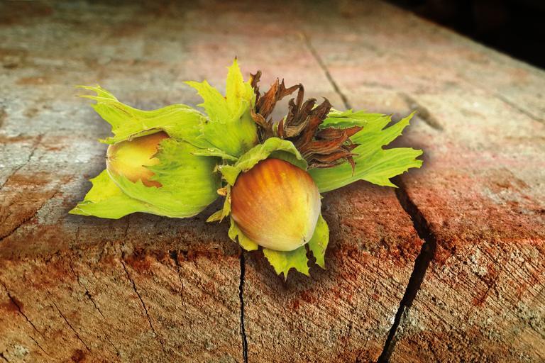 Keywords: hazelnut nut late summer autumn food brown shell tasty eat nutritious still life tree fruit healthy board old green