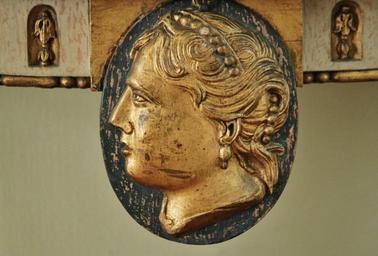 Keywords: head portrait woman's head carving art antique gold gilded biedermeier furniture pieces emblem detail furniture detail bust roman