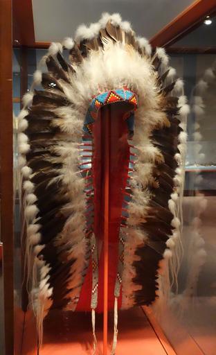 | View Original: | Headdress owned by Sitting Eagle (John Hunter), Nakoda, early 1900s, front view, eagle feathers, rabbit fur, horsehair, hide, glass beads - Glenbow Museum - DSC00933.JPG (3166x5193) | |||