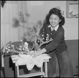 Keywords: Heart Mountain Relocation Center, Heart Mountain, Wyoming. Ruby Hifumi, 16 year old high school stu . . . - NARA - 539162.jpg Scope and content The full caption for this photograph reads Heart Mountain Relocation Center Heart Mountain Wyoming Ruby Hifumi 16 year old high school student with a special New Year's flower arrangement The material is a piece of pine a sprig of sage with paper flowers indicating a plum tree and paper bamboo The flower arrangement of the three materials symbolizes in order hardness courage and strength General notes 539162 Local identifier 210-G-E604 Department of the Interior War Relocation Authority 02/16/1944 - 06/30/1946 NARA-Author Parker Tom Photographer 4682167 <br /> Still Picture Records Section Special Media Archives Services Division NWCS-S National Archives at College Park 8601 Adelphi Road College Park MD 20740-6001 1943-01-09 Record group Record Group 210 Records of the War Relocation Authority 1941 - 1989 Record group ARC 537 Central Photographic File of the War Relocation Authority compiled 1942 - 1945 Series ARC 536000 File unit File unit ARC Variant control numbers NAIL Control Number NWDNS-210-G-E604 Other versions <gallery> File Heart_Mountain_Relocation_Center _Heart_Mountain _Wyoming _Ruby_Hifumi _16_year_old_high_school_stu_ _ _ _-_NARA_-_539162 tif tif File Heart_Mountain_Relocation_Center _Heart_Mountain _Wyoming _Ruby_Hifumi _16_year_old_high_school_stu_ _ _ _-_NARA_-_539162 jpg jpg </gallery> NARA-cooperation PD-USGov Heart Mountain War Relocation Center Three friends of winter |