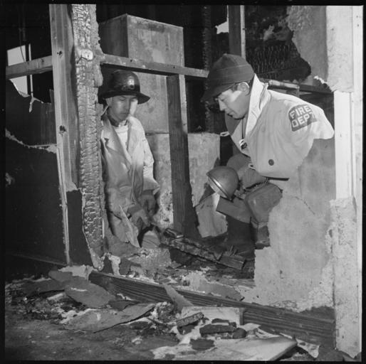 | Keywords: Heart Mountain Relocation Center, Heart Mountain, Wyoming. Temporary structures built of tar paper, . . . - NARA - 539275.jpg Scope and content The full caption for this photograph reads Heart Mountain Relocation Center Heart Mountain Wyoming Temporary structures built of tar paper wood and composition materials offer a constant fire hazard Here two center firement of Japanese parentage members of the Fire Prevention Squad carefully inspect the remains of a dormitory fire to determine exact causes Further work of the squad wll include an inspection of all similar buildings and correction of the construction details which caused this fire General notes 539275 Local identifier 210-G-E720 Department of the Interior War Relocation Authority 02/16/1944 - 06/30/1946 NARA-Author Parker Tom Photographer 4682167 <br /> Still Picture Records Section Special Media Archives Services Division NWCS-S National Archives at College Park 8601 Adelphi Road College Park MD 20740-6001 1943-01-04 Record group Record Group 210 Records of the War Relocation Authority 1941 - 1989 Record group ARC 537 Central Photographic File of the War Relocation Authority compiled 1942 - 1945 Series ARC 536000 File unit File unit ARC Variant control numbers NAIL Control Number NWDNS-210-G-E720 Other versions <gallery> File Heart_Mountain_Relocation_Center _Heart_Mountain _Wyoming _Temporary_structures_built_of_tar_paper _ _ _ _-_NARA_-_539275 tif tif File Heart_Mountain_Relocation_Center _Heart_Mountain _Wyoming _Temporary_structures_built_of_tar_paper _ _ _ _-_NARA_-_539275 jpg jpg </gallery> NARA-cooperation PD-USGov Heart Mountain War Relocation Center |