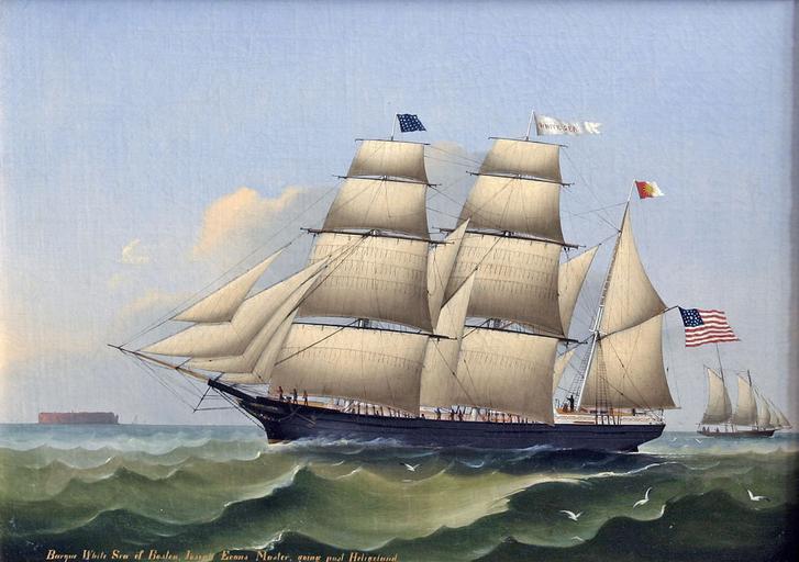 | Keywords: Heinrich Andreas Sophus Petersen - Barque WHITE SEA of Boston.jpg  Heinrich Andreas Sophus Petersen 1834-1916 Technique oil canvas cm 47 64 8 Barque White Sea of Boston Joseph Evans Master going past Heligoland ~ lower left text en The barque WHITE SEA built by Joseph Dyer on the Cape in Portland Maine near the Ferry Slip WHITE SEA was the only barque Joseph built in the years from 1851-56 alongside the ships KATE DYER PERSEVERANCE BAMBERG CORINTHIAN and later the United States Government ™s Gunboat KINEO Her captain listed as Joseph Evans in 1859 has the American vessel underway near the coast of Heligoland right off the mouth of the Elbe River http //www vallejogallery com/item php title Schooner_ESTELLE category Maritime_Paintings id 1546 vallejogallery com Heinrich And Sophus Petersen - Barque WHITE SEA of Boston 1859-06 Other versions http //images arcadja com/petersen_heinrich_and__sophus-the_barque_white_sea_of_boston~MNbb7~10000_20061202_N08153_193 jpg Image by Sotheby's 2005 via ARCADJA PD-old-auto-1923 1916 Heinrich Andreas Sophus Petersen Sailing ships of the United States Heligoland in art 19th-century sailing ships in paintings Historical images of square-riggers under sail Barques Three-masted ships 19th-century oil on canvas paintings 1859 paintings 19th-century ships 19th-century paintings location missing Images from Sotheby's |