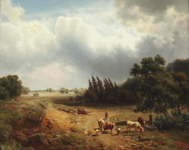 | Keywords: Heinrich Höfer - Eine bewaldete Landschaft mit Hirte und Kühen.jpg Heinrich Höfer 1825 “1878 de Eine bewaldete Landschaft mit Hirte und Kühen 1862 oil canvas cm 44 2 55 4 object history credit line signed inscribed and dated 'Hofer München 1862' lower right accession number christies online 5523842 PD-old-100-1923 Heinrich Höfer Landscape paintings of Germany Paintings of cattle 1860s landscape paintings | ||||