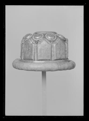 Keywords: Helbild mitra - Livrustkammaren - 9793.tif Mitra av hattformig modell med cylindrisk kulle med svagt rundad kant Vulstformigt brätte b ca 30 mm klätt med pergament ursprungligen med skinn Kullen klädd med delvis mycket slitet karminrött siden nertill vid brättet ring av förgylld silverplåt b 30 mm med graverad gammalslavisk text översättning se Bodin <br/>År 7 159 november 17 dagen gav statssekreteraren Michail Danilovs hustru änkan Uljana dotter till Vasilij denna biskopsmössa till Tjudovklostret till den undergörande Aleksijs hem till minne av sin make Michail Danilovitj eremitmunken Misail och sin dotter Ksenia för sin själ<br/><br/>Därovanför en krans med sex ursprungligen nio helgonbilder graverade på rektangulära plåtar med trepassformig överdel mellersta bågen spetsig h 83 mm b 58 mm gammalslaviska texter <br/>1 - ett manligt helgon med otydlig text pete ; 2 - ärkeängeln Gabriel achange gabri ; 3 - Maria mrthy mätär Theo - Guds moder ; 4 - ärkeängeln Mikael achage michail ; 5 - evengelisten Petrus apoto petr ; 6 - helgon i biskopsdräkt st alekse miro <br/><br/>På kullens översida en krans med nio runda plåtar med serafer och keruber fyra stycken med text serafim fem med cherubi <br/><br/>Mitt på kullen en stor rund plåt d 102 5 mm med Maria och Jesusbarnet text mrthy Guds Moder <br/><br/>Runt plåtarna broderier med silke silvertråd och -paljetter två ovala genomborrade glaspärlor bevarade <br/><br/>Hatten invändigt stoppad och klädd med blekrött siden original caption helbild mitra LRK 5388 Slaget vid Narva 1650 silver thread - silver - silk Färg röd karminröd material siden - parchment size mm 265 bräm g 6145 size mm 150 ca size mm 195 kulle LRK Karl XII av Sverige Mille ans de tradition chret 1988-1989 Kungens lockpipa 1995-1996 Karl XII och Peter den store 1998-1999 Krigsbyte 2007-2008 300-årsminnet av slaget vid Poltava / Poltava 300 Years Eremitaget och Kreml-museet 2009-2010 achange gabri Gabriel achage michail Mikael mrthy Mätär Theou - Guds Moder Maria apoto Petr S t Petrus Per st alekse miro S t Alexej Miro achange gabri Gabriel achage michail Mikael mrthy Mätär Theou - Guds Moder Maria apoto Petr S t Petrus Per st alekse miro S t Alexej Miro place of origin original filename LN_B09461_012341 42045 inventory number LRK 5388 9793 CC0 Helbild mitra - Livrustkammaren - 9793-negative tif <gallery caption Different images of same object > File Mitra ovanifrån - Livrustkammaren - 18355 tif </gallery> Battle of Narva 1700 Headgear Media contributed by LSH dim-with multiple size templates Media contributed by LSH 2013-10 |