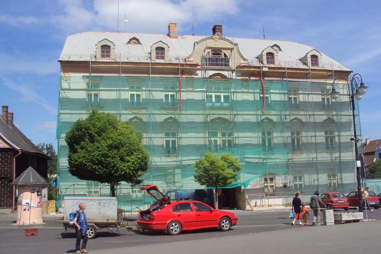 Keywords: Heldovka v lešení.JPG cs Budova v lešení kvůli opravě omítky na čelní straně own Zákupák 2014-06-19 Eduard Held Muzeum
