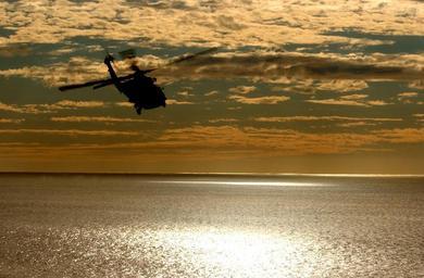 Keywords: helicopter aircraft sunset sky clouds colorful sea ocean water light reflections nature outside beautiful army