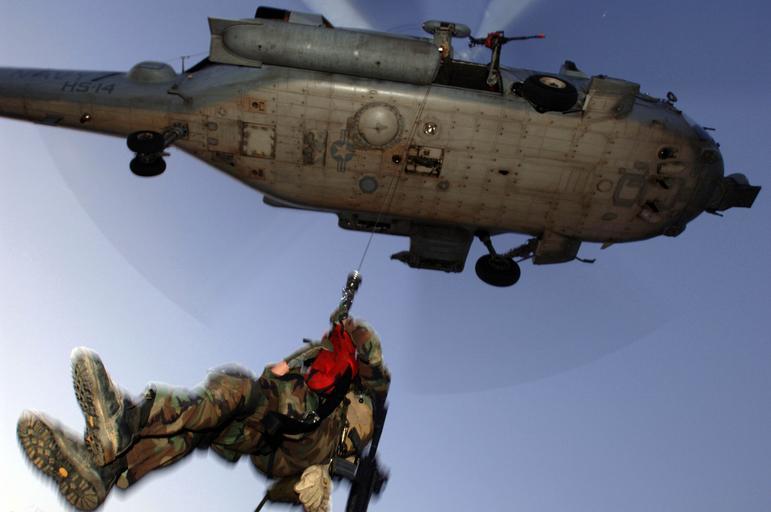 Keywords: helicopter navy sky clouds sailor raising lifting rescue training military