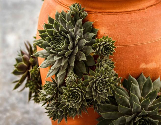 Keywords: hen and chicks hens and chickens hen and biddies succulent rosette terracotta strawberry jar strawberry pot plant gardening