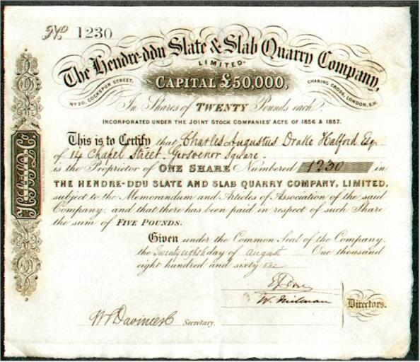 Keywords: Hendre-DduShareCertificate.jpg A share certificate of the Hendre-Ddu Slate and Slab Quarry Co Ltd 1861 Author Gwernol PD-old Stock certificates Industrial heritage in Wales Mining in Wales Mining railways