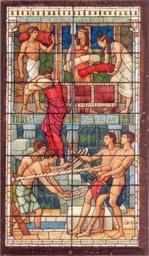 Keywords: Henry Holiday textile arts in ancient Egypt.jpg Modello or cartoon for three-panel stained glass window Domestic Arts in Ancient Egypt for the Household Sciences building of the University of Toronto Right panel Beating Flax and Storing Cloth one-inch scale by Henry Holiday watercolour and gouache over graphite with opaque white on cream wove paper Now in the Royal Ontario Museum Scanned from The Earthly Paradise Arts and Crafts by Wiliam Morris and his Circle in Canadian Collections edited by Katharine A Lochnan Douglas E Schoenherr and Carole Silver Key Porter Books 1993 ISBN 1-55013-450-7 ca 1914 Creator Henry Holiday PD-Art Henry Holiday Egyptian revival art Cartoons for stained glass Textile arts Collections of the Royal Ontario Museum Industry of Egypt Stained glass windows in Ontario |