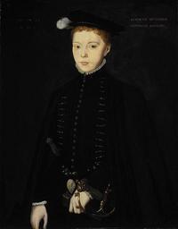 | Keywords: people indoor monochrome Henry Stuart, 1st Duke of Albany (7 December 1545 – 10 February 1567), commonly known as Lord Darnley, was a Prince Consort of Scotland, the first cousin and second husband of Mary I, Queen of Scots, and the father of her son King James VI, who also succeeded Queen Elizabeth I as King James I of England. Darnley was born in 1545, at Temple Newsam, Leeds, in the West Riding of Yorkshire, England, the son of the 4th Earl of Lennox, and his wife, Margaret Douglas. His father lived in exile in England for 22 years, returning to Scotland in 1564.[1] Darnley was related to his future wife in at least four ways: they shared a grandmother in English princess Margaret Tudor (Mary descending from Margaret's marriage to James IV of Scotland, Darnley from Margaret's marriage to Archibald Douglas, 6th Earl of Angus), putting both Mary and Darnley high in the line of succession for the English throne; Darnley was a descendant of a daughter of James II of Scotland and thus also in line for the throne of Scotland; both were descendants of Joan Beaufort, Queen of Scotland (Mary through Joan's marriage to James I of Scotland, Darnley through her marriage to Sir James Stewart, the Black Knight of Lorn); and Darnley's family surname was due to a much more ancient connection to his male-line ancestor, Alexander Stewart, 4th High Steward of Scotland. The marriage took place on Sunday 29 July 1565,[2] in the Chapel-Royal of Palace of Holyroodhouse in Edinburgh. On the 30 July Darnley was given the title of King of Scots at a proclamation published at the Cross of Edinburgh,[3] but he was King Consort only, with no royal powers. His marriage to Mary, Queen of Scots, was a disaster. Darnley was three years younger than Mary (their birthdays were only a day apart) and not particularly mature. He was unpopular with the other nobles and had a mean and violent streak, aggravated by a drinking problem.[4] Within a short time, Mary became pregnant, but Darnley grew more and more demanding. His jealousy of Mary's private secretary, David Rizzio, by whom it was said that Mary had become pregnant, culminated in the bloody murder of the latter by Darnley and a group of his supporters, in the presence of the queen herself at The Palace of Holyroodhouse, Edinburgh. Archibald Douglas, Parson of Douglas, subsequently secured pardons for all those involved. Following the birth of their son, the future James VI, the succession was more secure; in late 1566 and early 1567, Darnley and Mary appeared to be close to reconciliation, as she was often seen visiting his chambers. But Darnley was unpopular and petulant and offended many who should have been his natural supporters, and Mary became frustrated at his insistence that he be awarded the Crown Matrimonial. There was also some evidence that he suffered from syphilis.[4] On 10 February 1567, the bodies of Darnley and his servant at the time were discovered in the gardens of the Hamiltons' house, Kirk o' Field, Edinburgh, where they had been staying. Darnley was dressed only in his nightshirt, suggesting he had fled in some haste from his bedchamber. A violent explosion had occurred that night at the house, but the evidence pointed to Darnley escaping attempted assassination, only to be murdered when he got outside. There was strong evidence that Darnley and his valet had been strangled and that the explosion was set as an attempt to cover up the murders. Suspicion fell on the Earl of Bothwell and his supporters, notably Archibald Douglas, Parson of Douglas, whose shoes were found at the scene, and upon Mary herself. Bothwell later "abducted" Mary, and held her for a week, at the end of which she agreed to marry him. Darnley's death was a key event in the downward spiral that led to her loss of the Scottish crown. Henry Stuart, 1st Duke of Albany (7 December 1545 – 10 February 1567), commonly known as Lord Darnley, was a Prince Consort of Scotland, the first cousin and second husband of Mary I, Queen of Scots, and the father of her son King James VI, who also succeeded Queen Elizabeth I as King James I of England. Darnley was born in 1545, at Temple Newsam, Leeds, in the West Riding of Yorkshire, England, the son of the 4th Earl of Lennox, and his wife, Margaret Douglas. His father lived in exile in England for 22 years, returning to Scotland in 1564.[1] Darnley was related to his future wife in at least four ways: they shared a grandmother in English princess Margaret Tudor (Mary descending from Margaret's marriage to James IV of Scotland, Darnley from Margaret's marriage to Archibald Douglas, 6th Earl of Angus), putting both Mary and Darnley high in the line of succession for the English throne; Darnley was a descendant of a daughter of James II of Scotland and thus also in line for the throne of Scotland; both were descendants of Joan Beaufort, Queen of Scotland (Mary through Joan's marriage to James I of Scotland, Darnley through her marriage to Sir James Stewart, the Black Knight of Lorn); and Darnley's family surname was due to a much more ancient connection to his male-line ancestor, Alexander Stewart, 4th High Steward of Scotland. The marriage took place on Sunday 29 July 1565,[2] in the Chapel-Royal of Palace of Holyroodhouse in Edinburgh. On the 30 July Darnley was given the title of King of Scots at a proclamation published at the Cross of Edinburgh,[3] but he was King Consort only, with no royal powers. His marriage to Mary, Queen of Scots, was a disaster. Darnley was three years younger than Mary (their birthdays were only a day apart) and not particularly mature. He was unpopular with the other nobles and had a mean and violent streak, aggravated by a drinking problem.[4] Within a short time, Mary became pregnant, but Darnley grew more and more demanding. His jealousy of Mary's private secretary, David Rizzio, by whom it was said that Mary had become pregnant, culminated in the bloody murder of the latter by Darnley and a gro