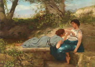| Keywords: Henryk Siemiradzki Das Gespräch.jpg Artwork Creator Henryk Siemiradzki de Frühere Variante der Komposition Der neue Armreifen von 1883 before 1883 oil on canvas cm 42 5 59 5 object history credit line signiert H Siemiradzky accession number http //www dorotheum com PD-old-100 Images from Dorotheum Ancient Roman historical paintings by Henryk Siemiradzki People in conversation in art Paintings of women sitting on outdoor benches Female couples in art | ||||