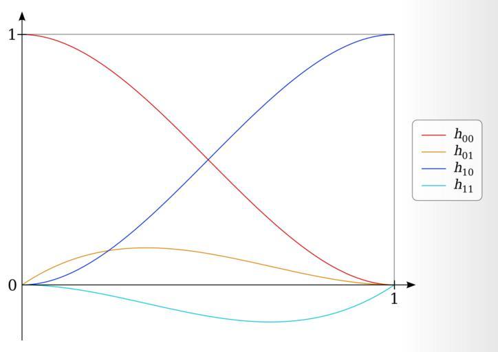 Keywords: Hermite spline functions.svg en Cubic Hermit spline function de Funktionen des kubischen hermitischen Splines h_00 2t 3 - 3t 2 + 1<br/> h_01 t 3 - 2t 2 + t<br/> h_10 -2t 3 + 3t 2<br/> h_11 t 3 - t 2 own Niabot 2010-11-01 Numerical analysis Charles Hermite