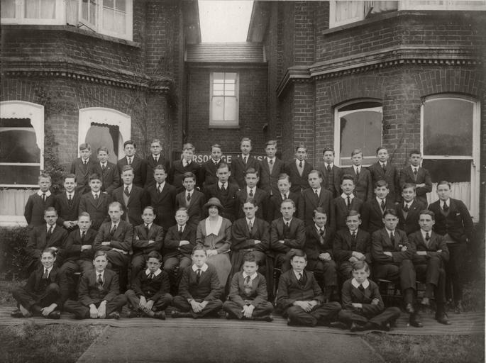 Keywords: Herne Bay College 1925.jpg Group portrait of pupils aged perhaps 13-18yrs at Parsonage House Herne Bay College Herne Bay Kent England The lady in the photograph could be the Matron The portrait is roughly A4 size mounted on a large card At the top of the card it says Herne Bay College with the coat of arms showing the Kentish white horse symbol the Herne Bay heron symbol and an open book On the card mount below the photo it says Parsonage House autumn 1925 The photographer has written in pencil Tower Studio Herne Bay This is the photographer who took over the studio from Fred C Palmer after 1922 Scan of original photograph in my possession 1925 Tower Studios Herne Bay; individual author is anonymous out of copyright PD-old-70 Historical images of Eddington Kent Schools in Kent |