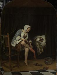 Keywords: Het toilet Rijksmuseum SK-A-4052.jpeg accession number SK-A-4052 Jan Havicksz Steen credit line nl Het toilet Zittend op de rand van haar bed trekt een jonge vrouw met een hoofddoek en een met bont afgezet jakje een kous over haar rechtervoet Op het kussen van het bed slaapt een hondje op de vloer liggen twee sloffen en een po ; Jan Havicksz Steen ca 1625 “1679 olieverf op paneel 1655 “1660 bovenhoeken afgerond Height cm 37 Width cm 27 5 exhibition history 2011-2012 Vermeer's Women Secrets and Silence Cambridge 2009-2010 Vermeer Rembrandt and the golden Age of Dutch Art Masterpieces from the Rijksmuseum Amsterdam - 3 Paris 2009-2009 Vermeer Rembrandt and the golden Age of Dutch Art Masterpieces from the Rijksmuseum Amsterdam Vancouver Canada 2005-2006 The Golden Age - Highlights from the Rijksmuseum - II - B Kobe 2005-2005 The Golden Age - Highlights from the Rijksmuseum - I - B Melbourne Institution Rijksmuseum Technique oil panel object history Acquisition 1961 object type Potential derivatives exist check http //commons wikimedia org/w/index php search Rijksmuseum+SK-A-4052 this search PD-US PD-old Data and photography rights All data and all images made available through the API are either in the public domain or are subject to a CC0 license https //www rijksmuseum nl/en/api/terms-and-conditions-of-use cc-zero place of creation http //www rijksmuseum nl/collectie/SK-A-4052 Het toilet Q17336080 Uploaded with GWToolset Het toilet Rijksmuseum SK-A-4052 http //www rijksmuseum nl/media/assets/SK-A-4052 Images uploaded by Fæ Images from the Rijksmuseum Paintings by Jan Steen in the Rijksmuseum Amsterdam Rabbit clothing in art Genre paintings by Jan Steen |