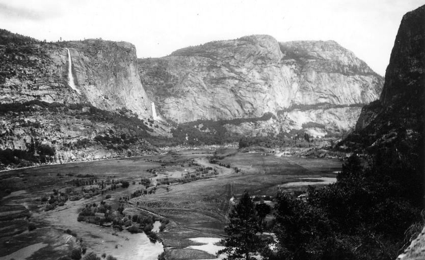Keywords: hetch hetchy valley 1900 tuolumne river mountain valley forest cliff hills small valley dams old black and white photograph former nature landscape wood tree fir conifer creek lake wallpaper