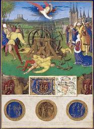Keywords: Heures d'Étienne Chevalier - Martyre de sainte Catherine.jpg Artwork creator Jean Fouquet A l'arrière plan le gibet de Montfaucon et l'église et la tour du Temple de Paris ca 1452-1460 illumination parchment cm 16 5 12 institution Musée Condé Bibliothèque Condé Nicole Reynaud Jean Fouquet - Les Heures d ™Ã‰tienne Chevalier Dijon Faton Ž 2006 280 p ISBN 2-87844-076-5 object history Ancien livre d'heures commandé par Étienne Chevalier trésorier du roi Charles VII Démembré et les miniatures découpées au début du XVIIIe siècle puis montées sur une planchette de bois par un menuisier encadreur parisien vers 1790 Propriété de Georg Brentano puis acquis auprès de son fils par Henri d'Orléans duc d'Aumale en 1891 Donné à l'Institut de France exhibition history Présenté dans le Santuario du musée depuis 1897 interdit de sortie du château de Chantilly en raison des conditions du don du duc d'Aumale credit line http //expositions bnf fr/fouquet/grand/f109 htm exposition bnf fr accession number Ms 71 PD-Art-100 Hours of Étienne Chevalier 06 Martyrdom of Saint Catherine of Alexandria Miniatures of Saint Catherine of Alexandria Gibet de Montfaucon Maison du Temple Paris Paris in the 15th century |