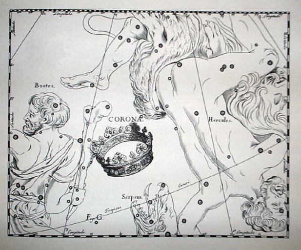 | Keywords: Hev 10 fig G corona.jpg it Tavola rappresentante la costellazione della Corona Boreale nel Firmamentum Sobiescianum sive uranographia contenuto nel Prodromus Astronomiae Лист F Севе ная Ко она Атласа звёздного неба Яна Гевелия п едставляющего собой п иложение к его книге «Prodromus Astronomiæ» опубликованной в 1690 году в Гданьске Изоб ажение зе кальное обычное для небесных глобусов показывающее вид небесной сфе ы «извне» http //www atlascoelestis com/hev 2060 htm 1690 Johannes Hevelius PD-old-100 Uranographia by Johannes Hevelius Firmamentum Sobiescianum sive uranographia Corona Borealis |