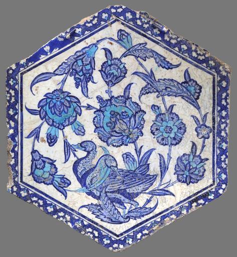 Keywords: Hexagonal Iznik tile with ducks V&A 1680-1892.jpg Hexagonal tile with ducks painted in cobalt blue and turquoise place of creation Iznik Turkey 1525-1550 but note below implies a date of 1540-1546 Fritware/stonepaste with underglaze decoration in cobalt blue and turquoise Width 27 9 cm Institution Victoria and Albert Museum Atasoy Nurhan; Raby Julian 1989 Iznik The Pottery of Ottoman Turkey London Alexandra Press ISBN 978-1-85669-054-6 </br> cite journal Lane Arthur 1957 The Ottoman Pottery of Isnik Ars Orientalis 2 247 “281 https //www jstor org/stable/4629039 seq 1 page_scan_tab_contents JSTOR 4629039<br>Porter Venetia 1995 Islamic Tiles London British Museum Press ISBN 978-0-7141-1456-9 object history credit line The tile is illustrated in B W in Lane 1957 p 266 and fig 36 This tile is one of 39 tiles or tile fragments in the V A Museum that the museum believes come from the Hayreddin bathhouse Cinili Hamam or Tiled bathhouse located on Itfaiye Street in Istanbul This is explained in the entry for another tile with http //collections vam ac uk/item/O224115/tile/ Inv no 961-1892 The bathhouse was built by Barbaros Hayreddin PaÅŸa in 1540-1546 Barbarossa died in 1546 The building was sold off in the 19th century and the remaining tiles removed and sold The V A has another similar tile http //collections vam ac uk/item/O225308/tile-unknown/ Accession number CIRC 30-1953 There are identical tiles in the Harvard Museums http //www harvardartmuseums org/collections/object/316973 Accession number 9 2006 and the British Museum http //www britishmuseum org/research/collection_online/collection_object_details aspx objectId 238595 partId 1 Accession number 1892 0613 69 The example in the British Museum is illustrated in Porter 1995 p 105 fig 93 and Atasoy Raby 1989 p 134 fig 225 in B W There are also two identical tiles in the Leighton House Museum in London that are plastered into the north wall of the central hall accession number http //collections vam ac uk/item/O224585/tile-unknown/ 1680-1892 own photo date 2015 Aa77zz artwork license PD-old-100 photo license other versions İznik ceramics Ottoman art in Victoria and Albert Museum Plant-scroll ornament |