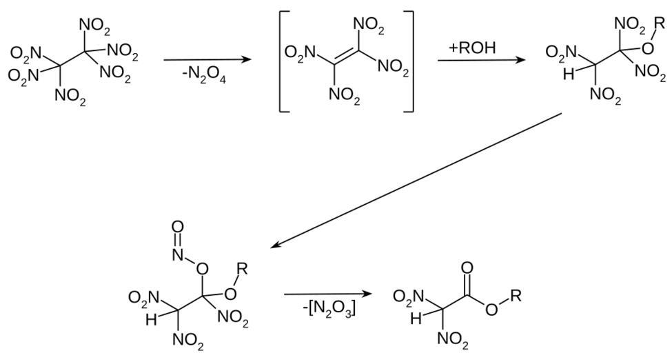 Keywords: Hexanitroethane reactions02.svg en Hexanitroethane - reaction with alcohols de Hexanitroethan - Reaktion mit Alkoholen own Steffen 962 2012-05-06 PD-chem Hexanitroethane Cc-zero