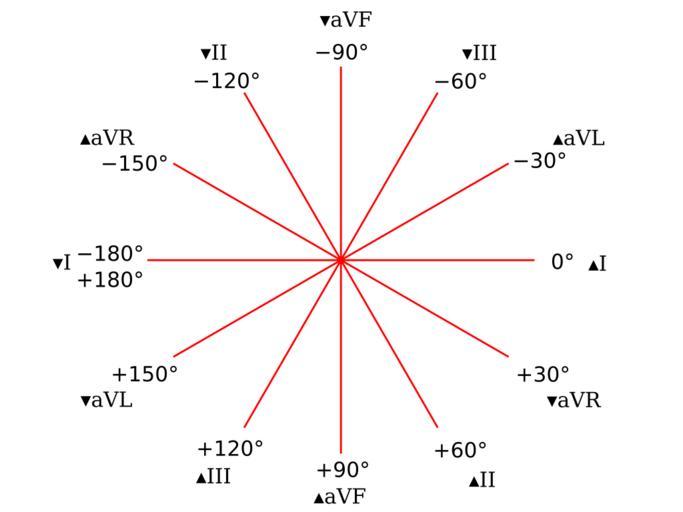Keywords: Hexaxial reference system.svg The hexaxial reference system Self-made in Inkscape based on en Image Hexaxial jpg originally by MoodyGroove 2007-08-27 User MoodyGroove User Mysid ECG principle Electrophysiology Medical tests