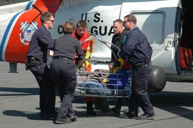 | Keywords: HH-60 JAYHAWK HIOST BASKET DVIDS1078560.jpg en KODIAK Alaska A Survivor is rushed from a Coast Guard HH-60 Jayhawk helicopter by Coast Guardsmen and Coast Guard Fire Department firefighters after a DeHaviland Beaver float plane operated by Andrew Airways crashed in Hallo Bay with six people on board All six people were rescued by air crews from Coast Guard Air Station Kodiak The Coast Guard rescue coordination center in Juneau received a call at 1 12 p m regarding the downed aircraft which was enroute from Hallo Bay to Kodiak A Coast Guard C-130 arrived on scene and immediately deployed several life rafts Two Coast Guard C-130 aircraft and two helicopters an HH-60 Jayhawk and an HH-65 Dolphin from Coast Guard Air Station Kodiak responded to the crash Both C-130 aircrews and the Dolphin aircrew were diverted from training missions near the area of the crash which saved precious time The Jayhawk crew rescued four people in the water and the Dolphin crew rescued the remaining two All passengers from the Beaver were transported to Kodiak where they were treated for hypothermia and minor injuries Official Coast Guard photo by Petty Officer Paul Roszkowski 2006-05-22 Petty Officer 1st Class Paul Roszkowski https //www dvidshub net/image/1078560 1078560 2013-12-11 18 08 KODIAK AK US PD-USGov Air Station Kodiak Eurocopter HH-65/MH-65 Dolphin Images from DoD uploaded by Fæ |