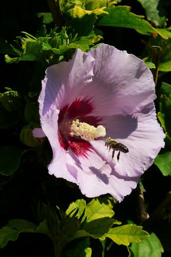 Keywords: hibiscus blossom bloom bee purple plant mallow close