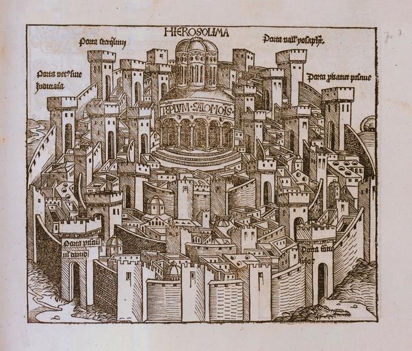| Keywords: Hierosolima-1493.jpg מפה ש ירוש י http //web nli org il/sites/NLI/Hebrew/digitallibrary/Laor-Collection/Pages/maps aspx en An imaginary representation of the Temple in the midst of walled-in Jerusalem Woodcut by Wohlgemut from Liber Chronicarum by Schedel 1493 he תאור דמיוני ש ירוש י מוקפת חומה ובית המקדש במרכזה חתוך עץ מאת וו גמוט מתוך ספרו ש שד 1493 Dimensions 190 x 225 mm http //web nli org il/sites/NLI/Hebrew/digitallibrary/pages/viewer aspx presentorid NLI_MAPS_JER DocID NNL_MAPS_JER002368175 Click to enlarge http //web nli org il/sites/NLIS/en/Maps The Eran Laor Cartographic Collection National Library of Israel 2015-12-08 17 29 30 http //web nli org il/sites/NLI/English/Pages/default aspx The National Library of Israel PD-old Old maps of Jerusalem GLAM National Library of Israel Schedelsche Weltchronik |