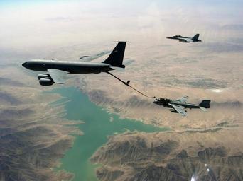 Keywords: High-flying fill up over Afghanistan DVIDS114302.jpg en An EA-6B Prowler assigned to the Cougars of Tactical Electronic Warfare Squadron 139 re-fuels with a U S Air Force KC-135R tanking aircraft while an F/A-18F Super Hornet assigned to the Fighting Redcocks of Strike Fighter Squadron 22 flies alongside The aircraft are providing support to NATO and Afghan forces operating as part of Operation Enduring Freedom CVW-14 is deployed on the Nimitz-class aircraft carrier USS Ronald Reagan in the U S 5th Fleet area of responsibility 2008-09-04 US Navy https //www dvidshub net/image/114302 080904-N-+++++-001 2008-09-10 05 50 HELMAND PROVINCE AF 4 PD-USGov-Military-Navy Operation Enduring Freedom Helmand Province in the War in Afghanistan 2001-present F/A-18F Super Hornet in flight KC-135R Stratotanker EA-6B Prowler US Marine Corps Images from DoD uploaded by Fæ 2008 in aviation in Afghanistan Aerial photographs of military aircraft in flight Taken with Nikon Coolpix 4200 |