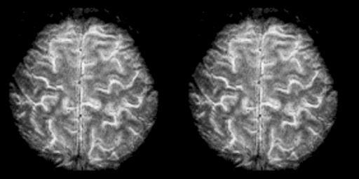 | Keywords: High Resolution FMRI of the Human Brain.gif  High Resolution FMRI of the Human Brain 1 mm cubical voxels at 3 Tesla The following images show the results from two functional MRI experiments The first with voxel dimensions 1x1x10 mm 3 and 1 slice; The second with voxel dimensions 1x1x1 mm 3 and 10 slices Both experiments used FOV 128 mm image matrix 128x128 and TR 2 s The background images are the 10 slices gathered in the first EPI shot of the high resolution experiment With this contrast CSF is the brightest gray matter next and white matter slightly darker than gray matter The task alternation is 40 s rest and 40 s bilateral finger tapping for a total of 150 acquisitions 300 s The function is calculated from all slices and rendered into 3D using AFNI Left 1x1x10 mm 3 data Right 1x1x1 mm 3 data At the start of the animation the 10 mm thick slab is viewed from above The color overlay that then appears represents the functional activation with red indicating signal changes under 15 and yellow signal changes over 20 The background images are rendered as partly transparent so that the color overlay can shine through As the animation progresses the viewpoint swings around to the side showing the function from different angles The background image then fades out completely and the activated volumes are left hanging in space while the viewpoint swings back to the original top-down orientation On the left the activated regions are crudely shaped along the inferior-superior axis due to the low spatial resolution in that direction The color shows that the estimated signal change due to activation is smaller in the low resolution dataset This is probably due to partial-volume effects not all of the volume of a 1x1x10 mm 3 voxel will be filled with activated tissue Since the signal from a voxel is averaged over its entire contents if only a small portion of the voxel has a large signal change the net measured result is a small signal change With smaller voxels the regions that are not active will be pruned away and the observed signal changes will be larger A confounding problem occurs at high resolution when the activation is over a large region In MRI the intrinsic signal-to-noise ratio SNR declines as the voxel size shrinks For a fixed number of image acquisitions and for a fixed statistical threshold lower SNR means that only larger signal changes can be detected This effect can be overcome by acquiring more images This effect is also partly mitigated by the fact that much of the interfering noise in the detection of FMRI signal changes is not truly MRI noise but is physiological in origin This type of noise will decline as the voxel size shrinks http //afni nimh nih gov/afni/about/images/1mm html National Institute of Mental Health PD-USGov Functional magnetic resonance imaging Animated GIF Animations on black background Magnetic resonance imaging of the brain Signal-to-noise ratio |
