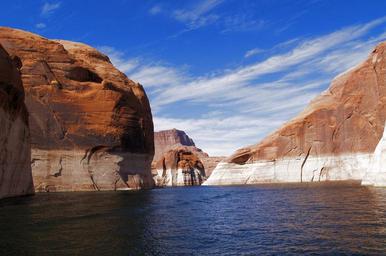 | Keywords: high rock near rainbow bridge lake powell arizona usa page tourist attraction monument native sacred place landscape outdoor hot dry scenery nature desert landing pier water reservoir activity house boat idyll idyllic blue sky cirrus clouds |