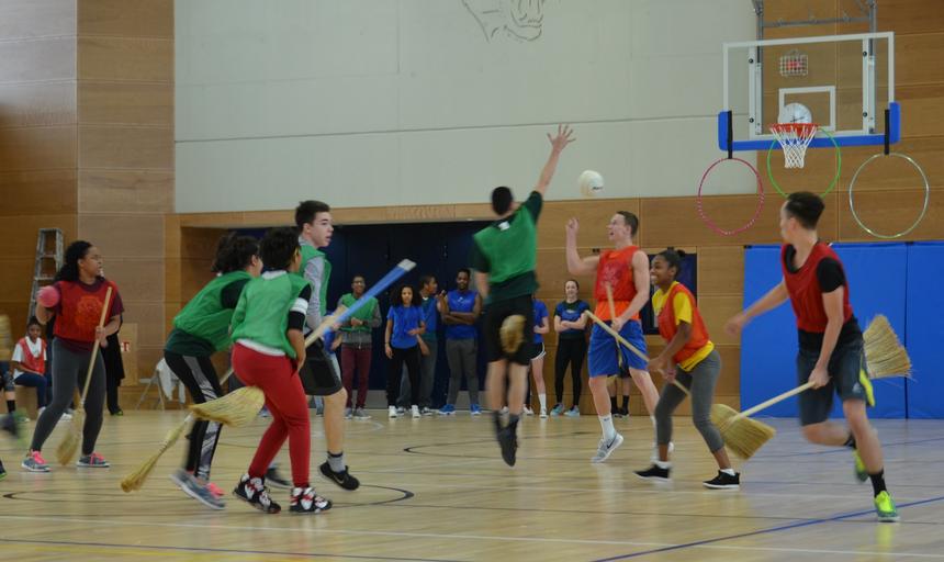 | Keywords: court game sport team sport For one week, Ansbach Middle/High School was turned into "Hogwarts School of Witchcraft and Wizardry," based on J.K Rowling's Harry Potter books. The highlight and culmination of the week-long project, hosted as part of "Read across America Week," was a Quidditch tournament and the award ceremony for the house cup. (U.S. Army photos: Bianca Sowders, USAG Ansbach Public Affairs) For one week, Ansbach Middle/High School was turned into "Hogwarts School of Witchcraft and Wizardry," based on J.K Rowling's Harry Potter books. The highlight and culmination of the week-long project, hosted as part of "Read across America Week," was a Quidditch tournament and the award ceremony for the house cup. (U.S. Army photos: Bianca Sowders, USAG Ansbach Public Affairs) |