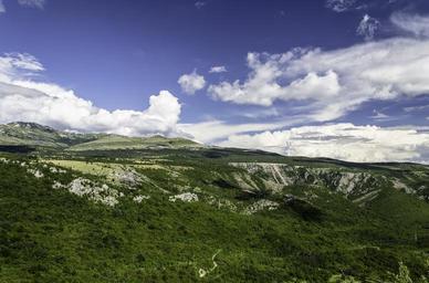 Keywords: highlands view panorama mountains landscape rocks vegetation cloudscape forest trees clouds summer season nature hill scenic valley outdoor