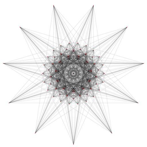 | Keywords: Higman-Sims-15.svg Higman-Sims graph as an orthogonal projection from a subset of the Leech lattice emphasizing a rotational symmetry of order 11 There are 11 possible such projections if we require all 22 points connected to the center point to form a regular 22-gon around it graphe de Higman-Sims comme projection orthogonale d'un sous-ensemble du réseau de Leech mettant en évidence une symétrie rotationnelle d'ordre 11 Il y a 11 telles projections possibles si on impose aux 22 points reliés au point central de former un 22-gone régulier autour de lui own Gro-Tsen 2010-10-30 Higman-Sims Graph |