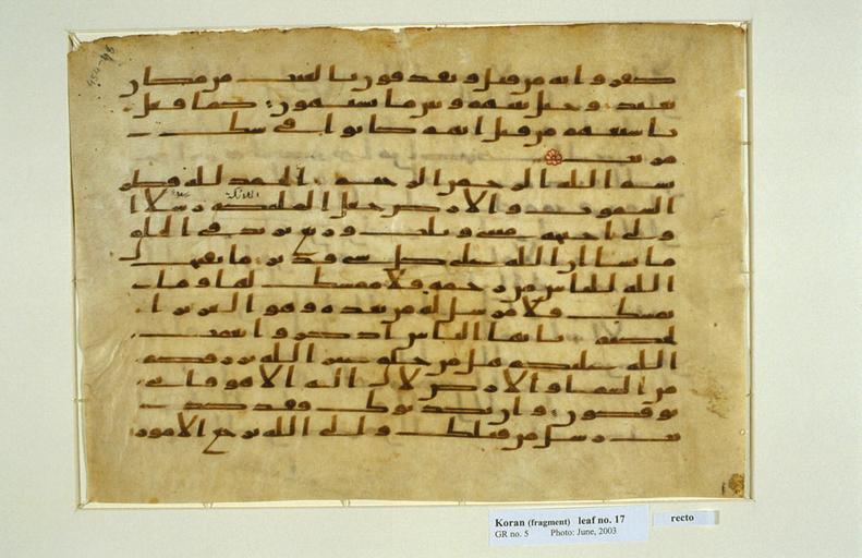 Keywords: Hijazi script - Qur'anic verses.jpg en Verses 53-54 of the 34th chapter of the Qur'an entitled Surat Saba' Sheba as well as the first four verses of the 35th chapter of the Qur'an entitled Surat al-Fatir The Originator The text is executed in Hijazi 1 script in black ink at fifteen lines per page This kind of script is typical of Qur'ans in the horizontal format produced during the 8th century LOC-calligraphy ascs 295 Unknown Calligrapher century 8 PD-Art Hijazi style Qur'an manuscripts 8th century Library of Congress Arabic Persian and Ottoman calligraphy collection |