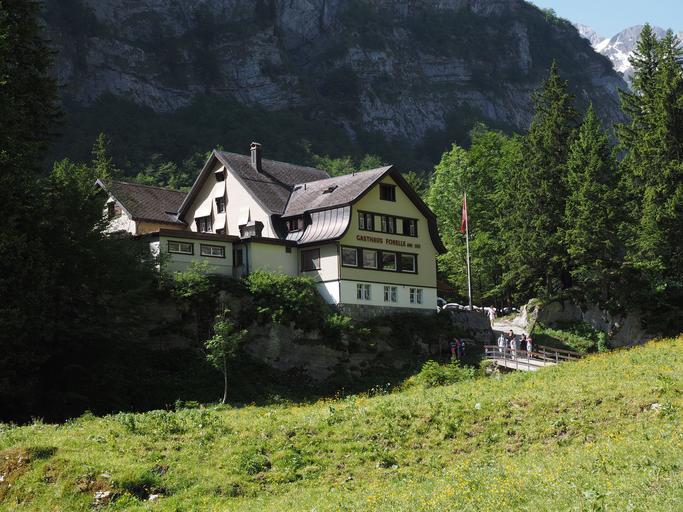 Keywords: hike hiking tour mountains alpine säntis mountain hut trout arrival berggasthaus trout seealpsee alpstein