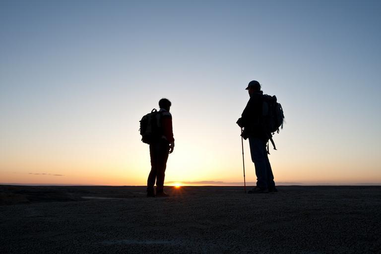Keywords: hikers silhouettes sunset twilight dusk sun sky trekking outdoors landscape men walk summit peak climbing backpackers