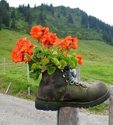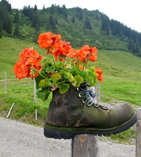 Keywords: hiking shoes shoe mountain shoe flowers geranium mountains allgäu meadow green away post nature fence firs trees flowerpot