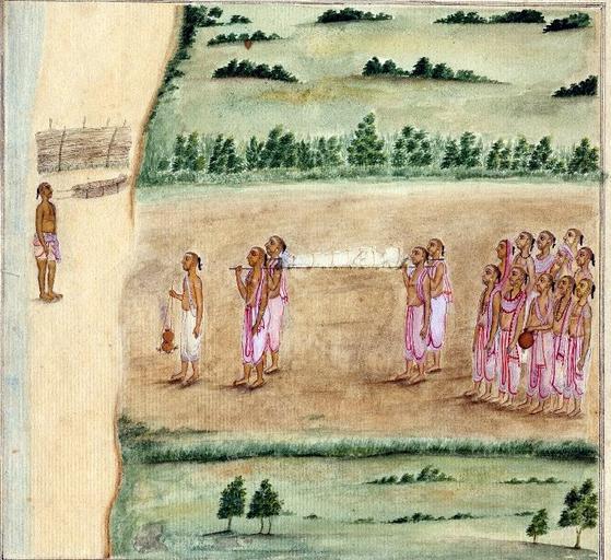 Keywords: Hindu funeral.jpg en Painting on paper depicting a deceased body being taken to a burning ground A funeral procession moves through a rural landscape dotted with trees and bushes The body in a white shroud is carried by four men with their hair shaved but for the tuft at the back of their head All wear tripundra marks on forehead and body They are preceded by the chief mourner clad in white who carries in a pot the fire with which he will set the funeral pyre ablaze Behind the stretcher carrying the body are a group of male mourners one of them carrying a large pot All of them are uniformly dressed in dhoti and angavastra and have their hair shaved but for the small tuft at the back of their head To the extreme left of the leaf is the funeral pyre and near it the attendant waits for the procession to arrive A vertical stripe of pale blue suggesting water concludes the painting to the left http //www britishmuseum org/research/search_the_collection_database/search_object_details aspx objectid 3058333 partid 1 searchText Hindu+funeral fromADBC ad toADBC ad numpages 10 orig 2fresearch 2fsearch_the_collection_database aspx currentPage 1 Author ca 1820 PD-art Dahasanskar Funerals in India 1820s paintings from India Dhoti Queues hair fashion Men's clothing of India in art Funeral processions in art |