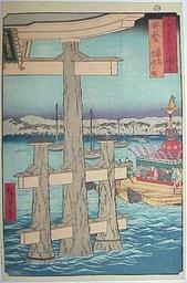 Keywords: Hiroshige Aki Miyajima.jpg en Aki Miyajima Sairei no zu of the Famous Scenes of the Sixty States ja 六十余州名 図会 安芸 宮島 祭礼の図 http //www japaneseprints-london com/ukiyoe/images/landscapes9 jpg Creator Hiroshige 1853 PD-old-100 The Famous Scenes of the Sixty States Itsukushima-jinja torii Miyajima in art Kangensai |