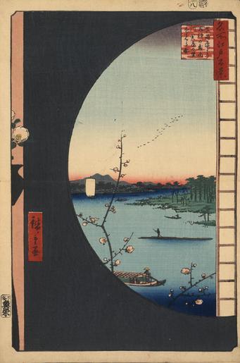 | Keywords: Hiroshige Hundred views Edo 36 Massaki-hen yori Suijin no mori uchigawa sekiya no sato o miru zu (真崎辺より水神の森内川関屋の里を見る図).tiff  en Hiroshige's window-framed view is punctuated by a flowering branch of budding plum or ume Ume which blooms in early spring have strong connections to the Asian continent especially in Chinese poetry and painting in which they are often portrayed together with the melodious uguisu or bush warbler Its blossoms were a popular inspiration for springtime flower appreciation including hanami flower viewing parties in early Japanese culture before the primary focus moved to sakura blossoms The perspective taken in this image may be from the second-story window of one of several restaurants at the Massaki Inari Shrine looking across the Sumida River Woodblock print from Hiroshige's Hundred famous views of Edo present day Tokyo 36 3 x 24 1 cm LOC-image jpd 02920 Creator Hiroshige Utagawa 1857 PD-Japan <gallery>File 100 views edo 036 jpg Brooklyn Museum</gallery> One Hundred Famous Views of Edo 036 Sumida River in ukiyo-e Arakawa Tokyo |