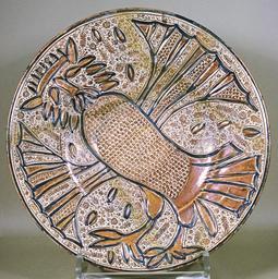 | Keywords: Hispano-Moresque - Plate - Walters 481099.jpg Heraldic animals-such as this fantastical owl wearing a crown-appear widely in Hispano-Moresque pottery with each center of production developing its own decorative elements The floral and foliage patterns surrounding the owl as well as the interlocking lines and circles comprising its torso were favored during the first half of the 16th century in the town of Manises in the province of Valencia Spain ca 1525 1550 earthenware with tin glaze and luster decoration cm 5 2 45 9 accession number 48 1099 40297 Henry Walters Baltimore date and mode of acquisition unknown Walters Art Museum Henry Walters Acquired by Henry Walters place of origin Manises Spain Walters Art Museum license Islamic art in the Walters Art Museum Ceramic plates Ataifor Hispano-Moresque ware |