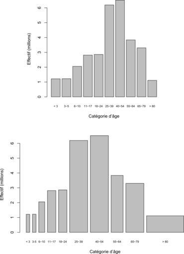 | Keywords: Histogramme age hommes france 2009 GNU R.svg fr Population masculine française en 2009 par classe d'âge Fait avec GNU R modifié avec Inkscape enregistré comme eps converti en pdf avec gsview importé dans Inkscape en French male population in 2009 by age categories Made with GNU R modified with Inkscape saved as eps converted to pdf with gsview imported into Inkscape 2013-02-08 10 19 54 own from http //www recensement-2009 insee fr/ INSEE ” Résultats du recensement de la population en 2009 table POP1A - Population par sexe et âge regroupé - Niveau agrégé Cdang cdang GNU R source code <source lang text > > hommes scan 1 1 214562 2 1 220968 3 2 053854 4 2 814253 5 2 858320 6 6 191481 7 6 518532 8 3 837422 9 3 303222 10 1 112268 11 Read 10 items > etiquettes scan what character 1 < 3 2 3-5 3 6-10 4 11-17 5 18-24 6 25-39 7 40-54 8 55-64 9 65-79 10 > 80 11 Read 10 items > barplot hommes names arg etiquettes + xlab Catégorie d'âge ylab Effectif millions cex names 0 7 > interv_ages c 3-0 5-3+1 10-6+1 17-11+1 24-18+1 39-25+1 + 54-40+1 64-55+1 79-65+1 110-80+1 > barplot hommes interv_ages names arg etiquettes + xlab Catégorie d'âge ylab Effectif millions cex names 0 7 </source> cc-zero Uploaded with UploadWizard GNU R Population pyramids of France |